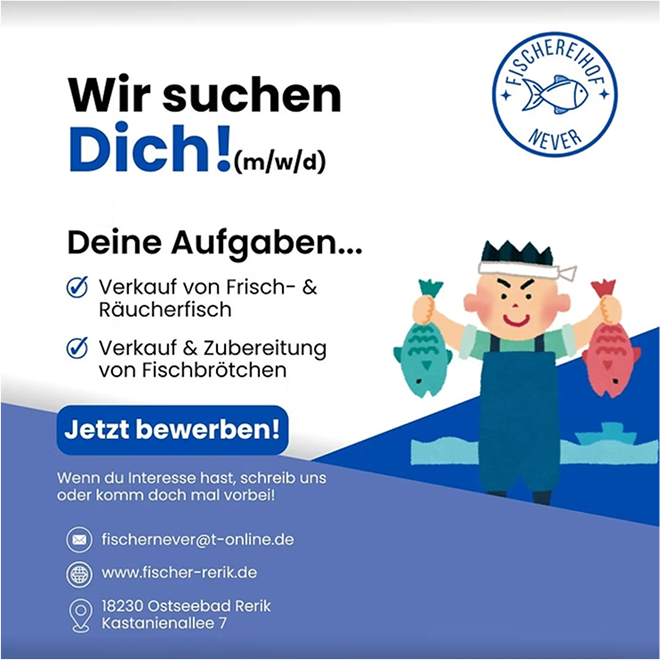 Wir suchen Dich! (m/w/d) – Ab sofort! Wir suchen Dich! (m/w/d) – Ab sofort! Unser Fischereibetrieb Never in Rerik sucht engagierte und motivierte Kollegen (Voll-, Teil- und Aushilfskräfte) für den Verkauf von Frisch- und Räucherfisch sowie die Zubereitung von Fischbrötchen.