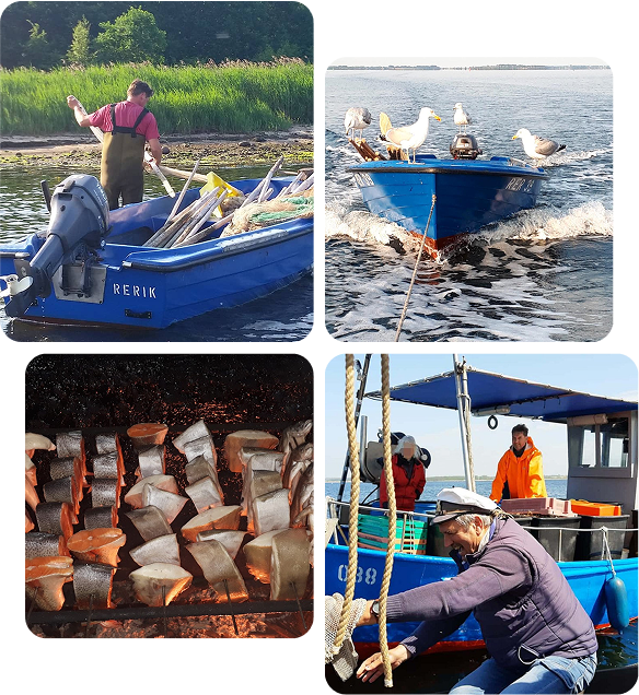 Im Sommer „läuft“ der Aal in die Körbe und mit den Stellnetzen fangen wir Scholle, Steinbutt und Meerforelle. In der Hauptsaison gibt es täglich, außer sonntags, Räucherfisch, Fischbrötchen und Frischfisch zu kaufen.
