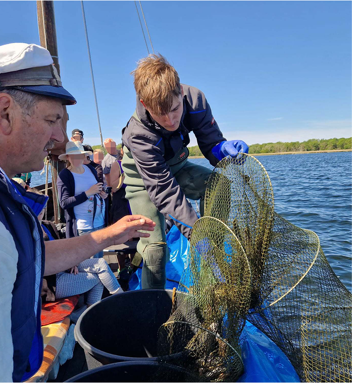 Seit vielen Jahren betreibt unsere Familie die Küstenfischerei. Ihr Gastgeber und Fischer Maik Never fängt und veredelt die „Früchte“ des Meeres. Bei Wind und Wetter ist er auf Salzhaff und Ostsee anzutreffen. Jede Jahreszeit hält etwas Besonderes bereit: Zu Beginn des Frühjahrs gibt es den Hering, danach kommen Hornfisch und Flunder. Ab Mai fangen wir für ca. 6 Wochen die Ostseekrabben im Salzhaff.